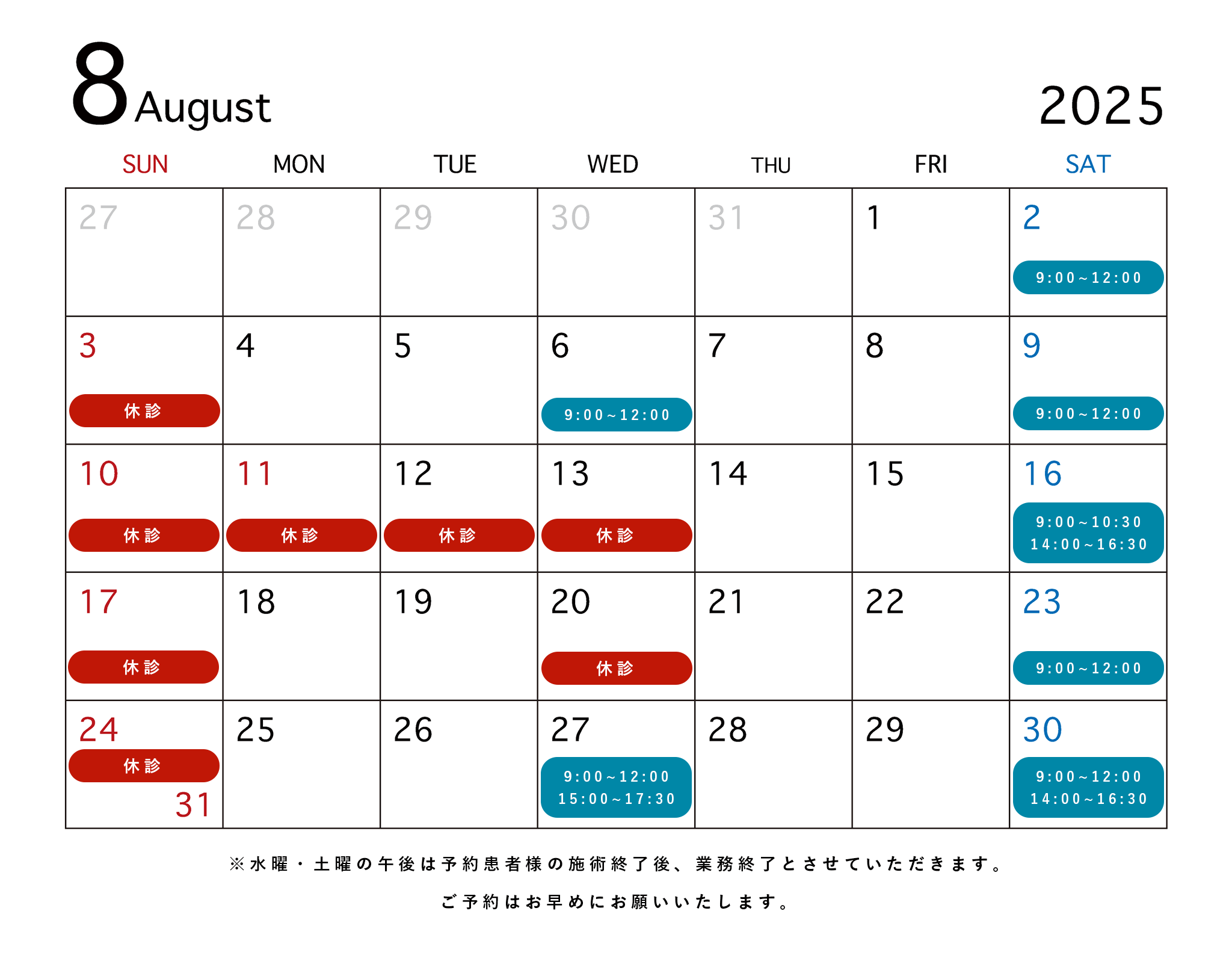 当院の8月の営業についてお知らせさせて頂きます。